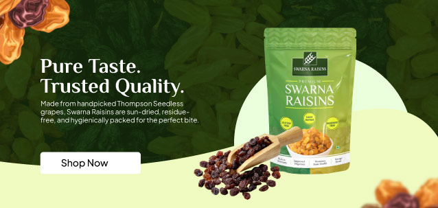 Discover why Swarna Raisins stand out in purity, taste, and nutrition. Pure sun-dried goodness from handpicked Thompson Seedless grapes.